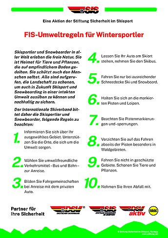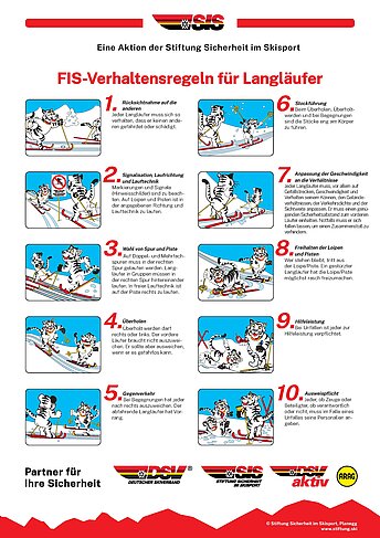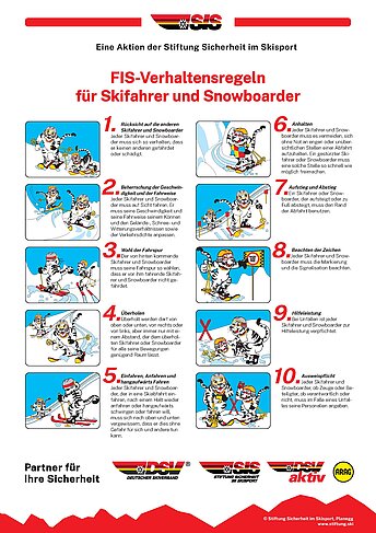 Die Stiftung Sicherheit im Skisport fördert konkrete Maßnahmen für mehr Sicherheit im Wintersport. Gemeinsam mit der FIS, DSV aktiv und dem DSV wurden Leitplanken für respektvolles und sicheres Verhalten entwickelt. Mit dem richtigen Verhalten vor bzw. während der Ausübung des Wintersports macht man sich Freunde und hilft Unfällen bzw. Streitigkeiten vorzubeugen. Tipps rund um eine sichere Vorbereitung und Planung einer Wintersportaktivität tragen zu einem gelingenden Erlebnis bei. Die FIS-Verhaltensregeln für die Piste, Loipe und im Umgang mit der Umwelt sind auch in den Gebieten vor Ort zu finden.