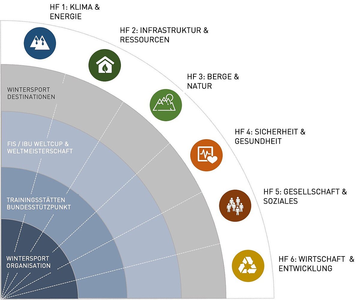 Die Handlungsfelder decken die Tätigkeiten der Wintersportorganisationen ab und adressieren jeweils mehrere Ziele der Agenda 2030. Sie verknüpfen verschiedene Sustainable Development Goals (SDGs) und bilden die übergeordneten strategischen Bereiche für den Wintersport. Sie erfordern eine koordinierte Anstrengung in den Wintersportverbänden, deren Veranstaltern, der Politik, den Sportlerinnen und Sportlern, um die Zukunft nachhaltig zu gestalten. Für diese Handlungsfelder haben wir Ziele, Maßnahmen und Schlüsselindikatoren definiert. Dies ist