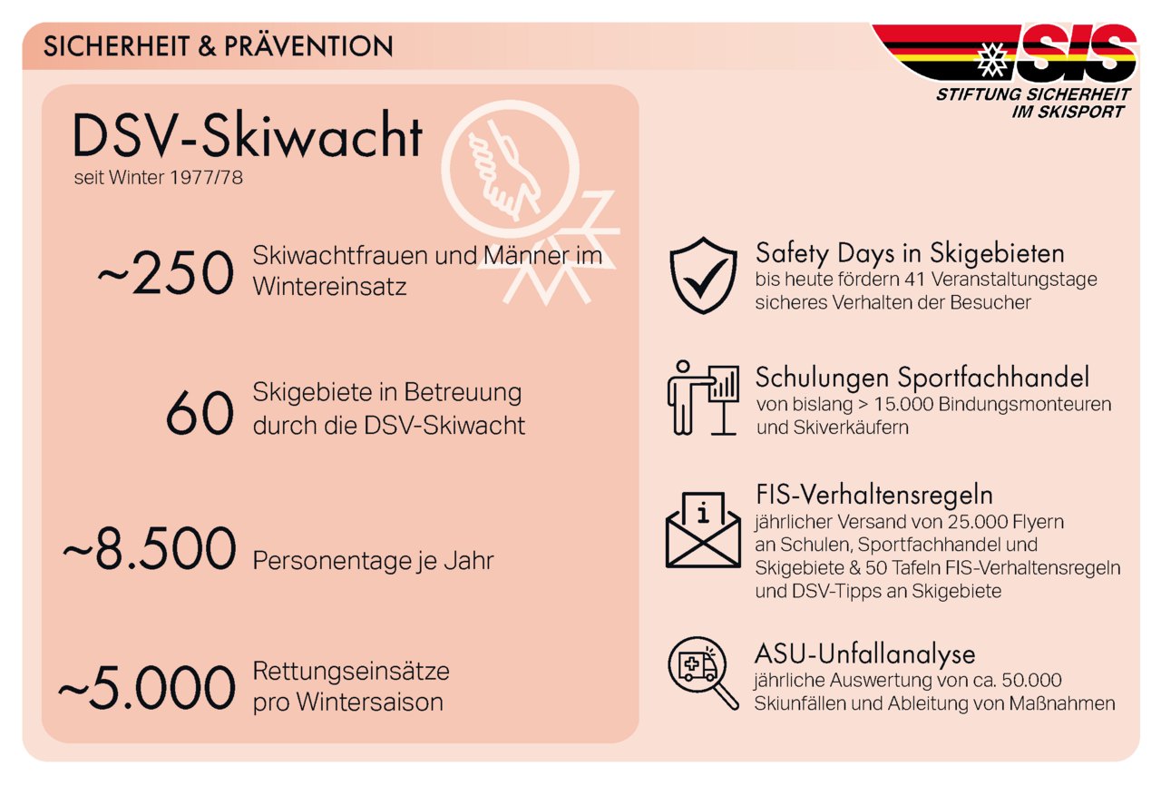 Die DSV-Skiwacht ist seit der Wintersaison 1977/78 in deutschen Skigebieten präsent und aus dem Wintergeschehen nicht mehr wegzudenken. Ihr Ziel ist es, Unfälle durch präventive Maßnahmen zu verhindern und in enger Zusammenarbeit mit den Skigebietsbetreibern für ein verantwortungsvolles Wintererlebnis zu sorgen. Was als Modellprojekt begann, hat sich zu einem flächendeckenden, professionell organisierten Sicherheitsnetz entwickelt. Heute sorgen rund 250 Skiwachtfrauen und -männer in etwa 60 Skigebieten in ganz Deutschland für Sicherheit, Aufklärung und schnelle Hilfe. Dabei ist der Anspruch hoch: Jede Skiwachtkraft ist umfassend geschult, Einstellungsvoraussetzung ist die ehrenamtliche, aktive Mitgliedschaft in der Bergwacht. Die Frauen und Männer der DSV-Skiwacht verbinden Fachwissen mit Engagement sowie Technik mit Einfühlungsvermögen.