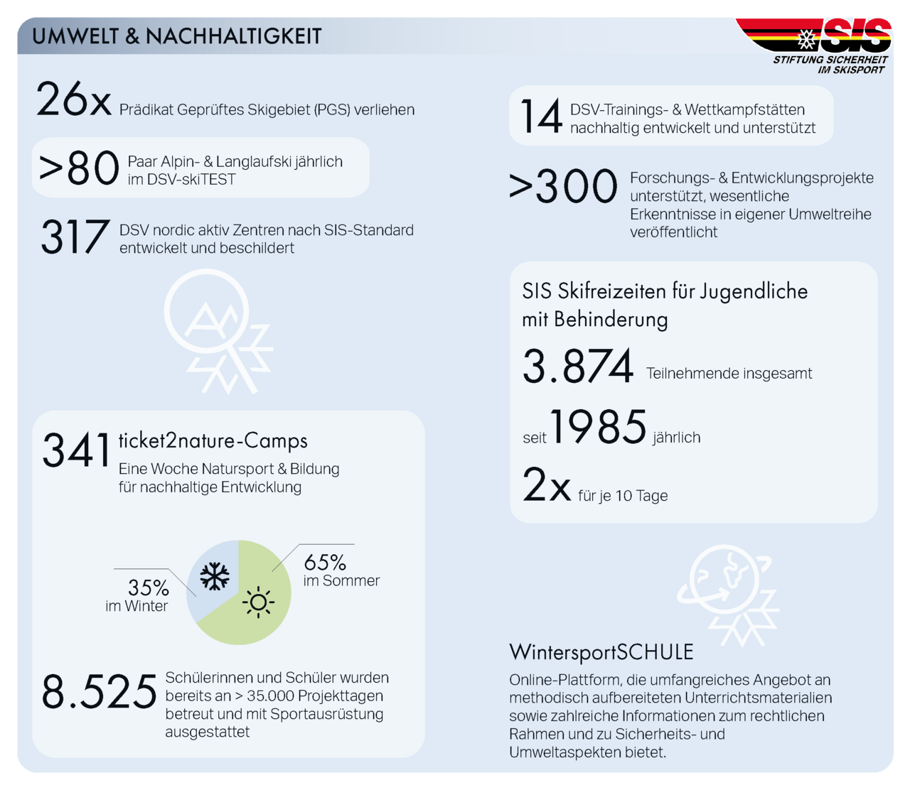 In Zusammenarbeit nut Unweltpädagogen, DSV-Ausbildern und Trainern wurde eine umfassende Konzeption für die Integration der Umweltbildung in die skisportliche Ausbildung erarbeitet: Konzeption der methodisch-didaktischen Grudlagen und Rahmenbedingungen einer Umweltbildung im DSV, Erarbeitung von Bausteinen der Umweltbildung für Aus- und Fortbildungslehrgänge.
